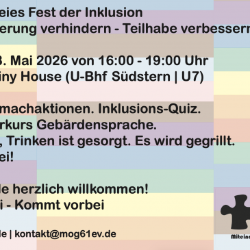 Teilhabe jetzt – laut für Menschenrechte! Rund um den 5. Mai, den Europäischen Protesttag zur Gleichstellung von Menschen mit Behinderung, organisiert der Verein Miteinander ohne Grenzen e. V. (mog61) seit Jahren eine Reihe vielfältiger Veranstaltungen, um auf die Situation von Menschen mit Behinderung aufmerksam zu machen und sich weiterhin für … Weiterlesen
