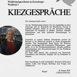 Offenes Kiezgespräch mit Dr. Turgut Altuğ, Abgeordneter im Kreuzberger Wahlkreis 3. Hier die Einladung: https://www.turgut-altug.de/images/files/veranstaltungen/kiezgespraeche2026/20260126_kiezgespraech_mog61.pdf Worum geht’s? Nachbarschaftsthemen, die euch bewegen Aktuelle politische Entscheidungen und ihre Auswirkungen Eure Anliegen – direkt mit Dr. Altuğ besprechen Wo?... Weiterlesen