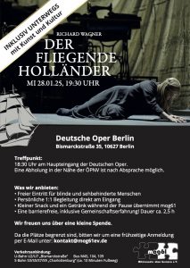 Im Rahmen unseres Projekts „Inklusiv unterwegs mit Kunst und Kultur“ laden wir herzlich ein, Richard Wagners Oper „Der Fliegende Holländer“ in einer speziell für blinde und sehbehinderte Menschen geeigneten Fassung mit Audiodeskription zu erleben. Gemeinsam entdecken wir Wagners Meisterwerk in einer barrierefreien Version, die ein unvergessliches Opernerlebnis ermöglicht.